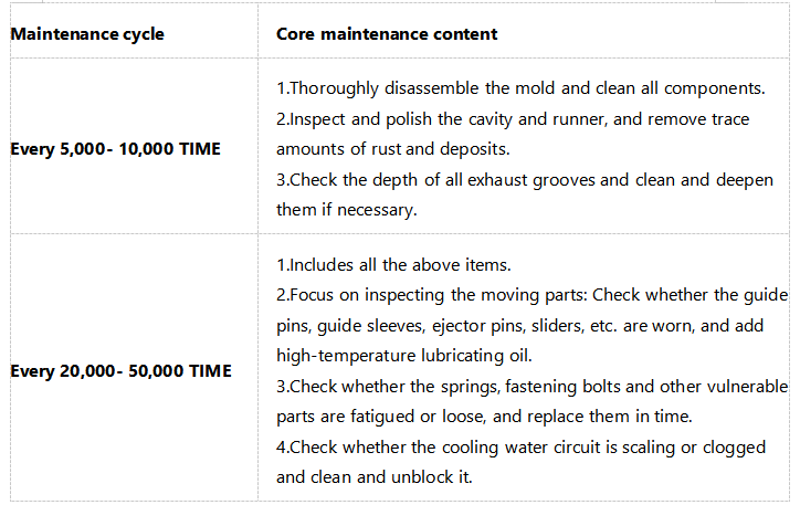 2.Daily cleaning: After each shift of production, the residual plastic, oil stains and moisture in the parting surface, cavity, runner and exhaust groove of the mold must be thoroughly cleaned with an air gun, soft cloth and special cleaning agent. It is strictly prohibited to forcibly scrape with hard metal tools to avoid scratching the surface of the cavity.
